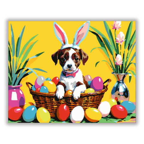 Nyuszifüles Kiskutya - húsvéti számfestő készlet – 40×50 cm (Keret nélkül) Ez a vidám festmény egy boldog és játékos hangulatot áraszt, amely azonnal mosolyt csal az arcodra. Egy kis kutya kalandja bontakozik ki a szemünk előtt, ahogy nyuszifülekkel egy k