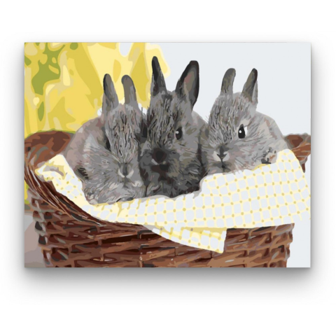 Nyuszik a kosárban - számfestő készlet – 40×50 cm (Keret nélkül) Ez a festmény meghitt és barátságos érzéseket kelt, mintha egy csendes tavaszi reggel melegsége áradna szét a szobában. A kép mesél egy történetet három apró nyusziról, akik békésen pihennek