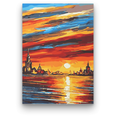 Öböl a Naplementében - Számfestő készlet – 40×50 cm (Keret nélkül) A festmény meleg, lenyűgöző naplementét ábrázol, amely nyugalmat és békét sugároz. A távolban rejtőző város sziluettje mesés történeteket sejtet a szemlélő számára. A vibráló narancs, kék