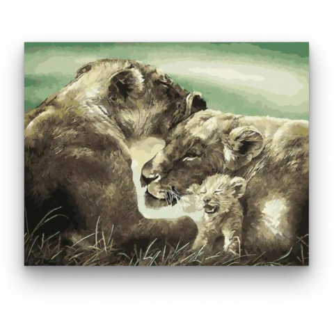 Oroszlán család - számfestő készlet – 40×50 cm (Keret nélkül) A festmény melegséget és nyugalmat sugároz, mintha egy titkos pillanatot ragadna meg a vadon szívében. Egy történet bontakozik ki az összetartozás és szeretet erejéről, amely minden nézőt magáv