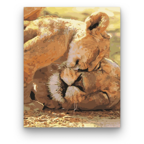 Oroszlán szeretet - számfestő készlet – 40×50 cm (Keret nélkül) Ez a festmény békés és meghitt pillanatot ábrázol, amely a nézőt nyugalommal tölti el. Két oroszlán bensőséges kapcsolata elevenedik meg előttünk, mintha egy titkos történet részesei lennénk.