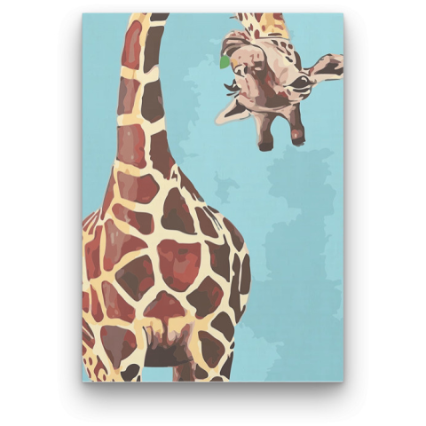 Őrűlt Zsiráf - számfestő készlet – 40×50 cm (Keret nélkül) Ez a kép vidám és játékos hangulatot áraszt, amely mosolyt csal az arcodra. Egy különleges pillanatot örökít meg, ahol az állatvilág bája és humora találkozik. A világos kék háttér kiemeli a zsirá