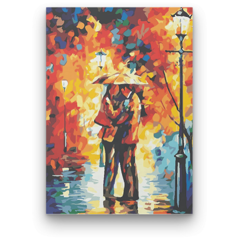 Őszi Szerelem - számfestő készlet – 40×50 cm (Keret nélkül) Ez a festmény egy meleg, meghitt pillanatot örökít meg, amely az őszi esték romantikáját idézi. Egy esernyő alatt összebújó pár története bontakozik ki a színek kavalkádjában, mintha egy titkos t