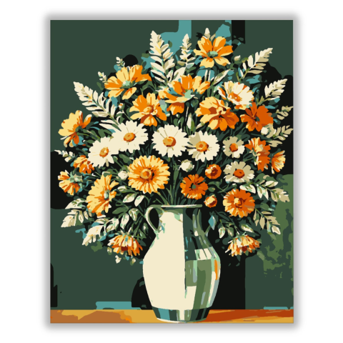 Őszi színek tündöklése - számfestő készlet – 40×50 cm (Keret nélkül) A festmény meleg, otthonos hangulatot áraszt, mintha egy régi vidéki ház konyhájába pillantanánk be. A kép története egy csendes reggelről mesél, ahol a napfény játékosan táncol a virágo