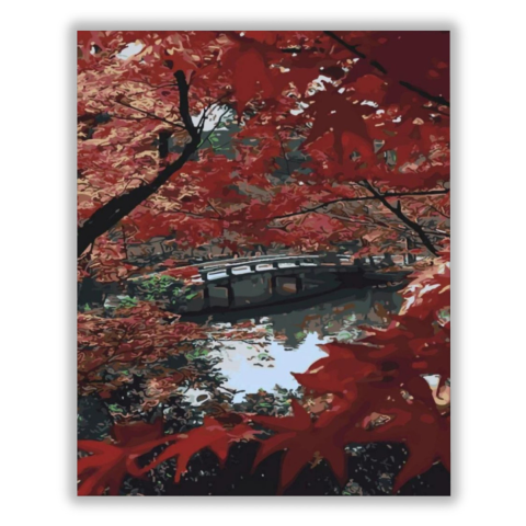 Őszi tó - számfestő készlet – 40×50 cm (Keret nélkül) Ez a festmény egy nyugodt őszi táj hangulatát idézi, amelyben a vörös lombok alatt rejtőző híd mesebeli történeteket sugall. A mélyvörös és zöld színek kontrasztja élénkíti a kompozíciót, miközben a há
