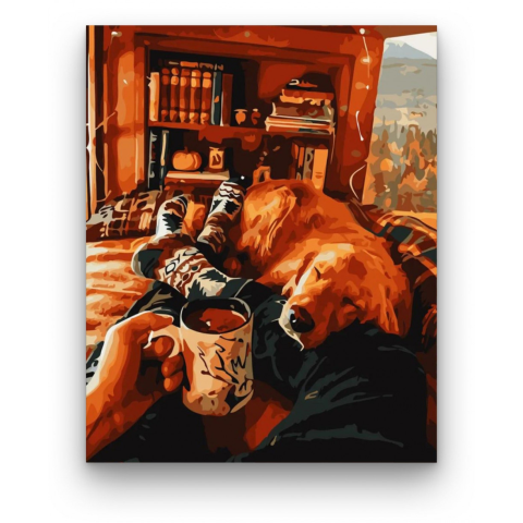 Otthoni pihenés - számfestő készlet – 40×50 cm (Keret nélkül) A festmény meghitt hangulatot áraszt, amely az otthoni kényelem és a pihenés pillanatait idézi. Egy történetet mesél el a csendes délutánokról, ahol minden gondolat lassan elcsendesedik. A mele
