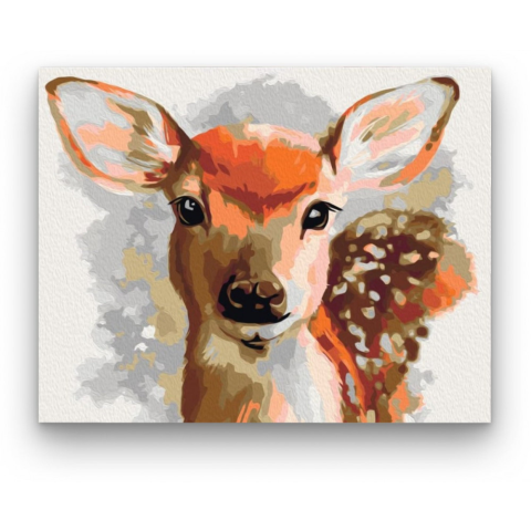 Őzike - számfestő készlet – 40×50 cm (Keret nélkül) A festmény meghittséget áraszt, mintha egy erdei mese elevenedne meg előttünk. Az őzike tekintete egy csendes pillanatot mesél el, ahol az ártatlanság és kíváncsiság találkozik. A meleg narancs és barna