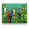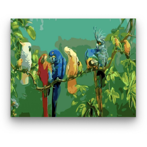 Papagáj gyűlés - számfestő készlet – 40×50 cm (Keret nélkül) A festmény élénk színeivel és vidám hangulatával az egzotikus természet varázsát idézi meg. Egy titokzatos történet bontakozik ki a papagájok gyűlésén, ahol minden madárnak saját karaktere van.