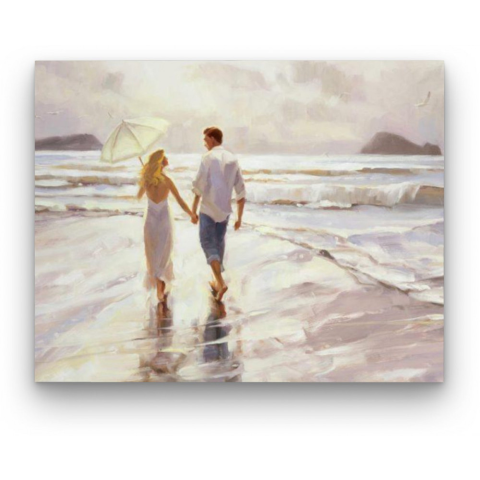 Pár a tengerparton- számfestő készlet – 40×50 cm (Keret nélkül) A festmény csendes, romantikus hangulatot áraszt, amely a nézőt azonnal egy nyugodt tengerparti sétára invitálja. A képen egy szerelmes pár története bontakozik ki, akik kéz a kézben fedezik
