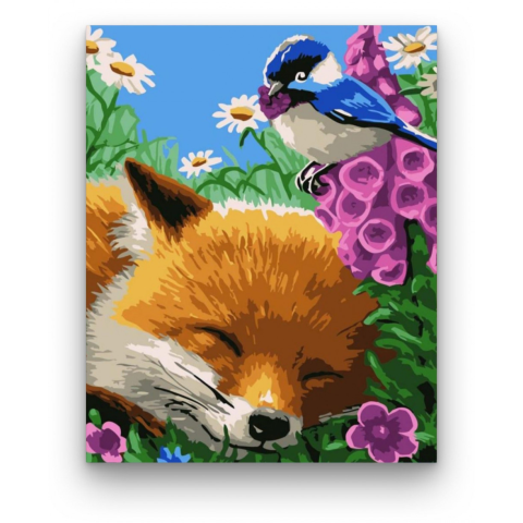 Pihenő róka - számfestő készlet – 40×50 cm (Keret nélkül) A festmény derűs és békés hangulatot áraszt, mely a nézőt egy nyugodt, mesebeli világba repíti. Egy elbűvölő történet bontakozik ki a kép előtt, ahol az állatok harmóniában élnek a természet ölelés