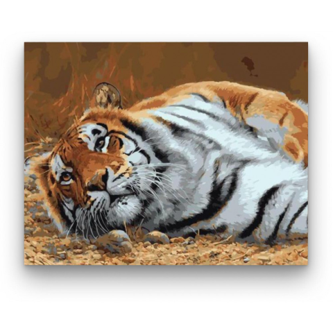 Pihenő tigris - számfestő készlet – 40×50 cm (Keret nélkül) A festmény nyugodt, mégis fenséges hangulatot áraszt, ahogy a tigris pihenő pozícióban figyeli a világot. Egy rejtett történet bontakozik ki, mintha a vadon mélyén pillanthatnánk meg egy ritka és