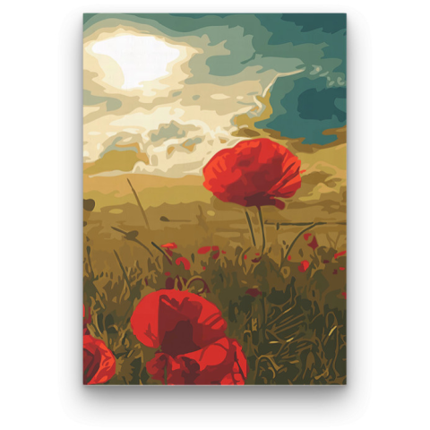 Pipacs - számfestő készlet – 40×50 cm (Keret nélkül) A festmény egy nyugodt, mégis élénk mező hangulatát idézi meg, ahol a pipacsok vöröse ragyog a lenyugvó nap fényében. Egy történet bontakozik ki a természet csendes szépségéről és az élet körforgásáról.
