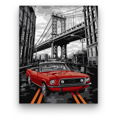 Piros cabrio - számfestő készlet – 40×50 cm (Keret nélkül) A kép egy izgalmas városi kaland érzését kelti, ahol a múlt és a jelen találkozik. A piros cabrio sugallja a szabadság és a felfedezés történetét az ikonikus híd alatt. A kontrasztos színek és az