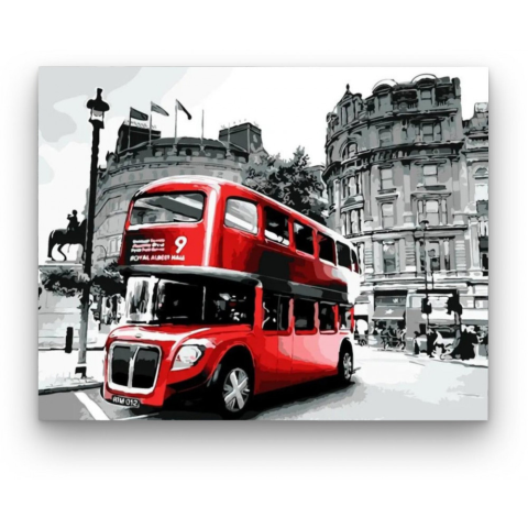 Londoni emeletes busz - számfestő készlet – 40×50 cm (Keret nélkül) A festmény dinamikus és élénk hangulatot áraszt, ahogy a híres londoni emeletes busz átszeli a várost. Egy történet bontakozik ki, ahol a városi élet lüktetése találkozik az ikonikus épít
