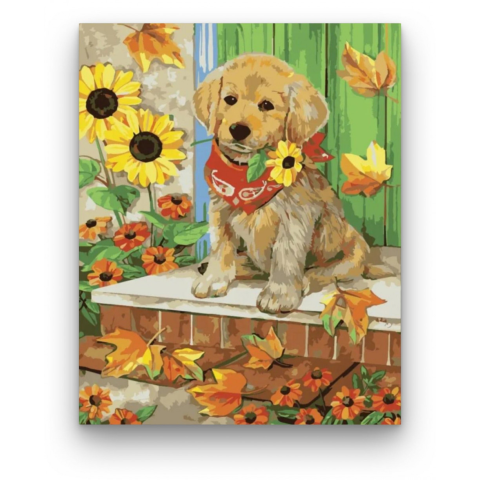 Piros kendős kiskutya - számfestő készlet – 40×50 cm (Keret nélkül) A festmény melegséget és örömteli hangulatot áraszt, ahogy a kiskutya barátságosan néz ránk. Az őszi levelek és virágok között játszódó jelenet egy boldog pillanatot mesél el. A színek él