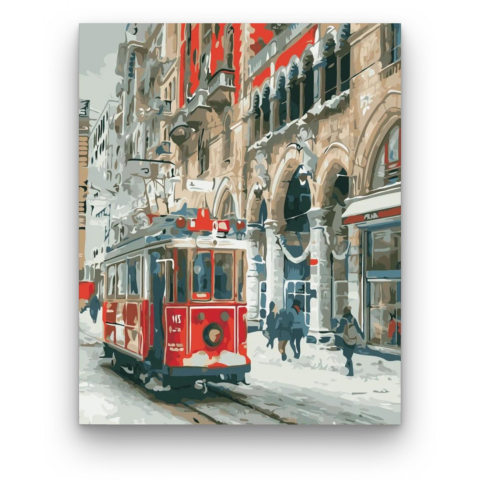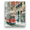 Piros villamos - számfestő készlet – 40×50 cm (Keret nélkül) A festmény egy nosztalgikus téli városi jelenetet ábrázol, ahol a piros villamos életet visz a hófödte utcák csendjébe. A kép története egy régi város hangulatát idézi, ahol a múlt és jelen talá
