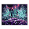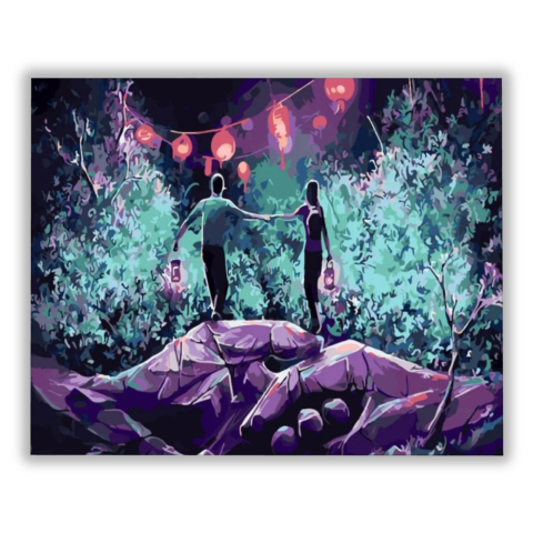 Romantika a természetben - számfestő készlet – 40×50 cm (Keret nélkül) A festmény varázslatos hangulatot áraszt, mintha egy mesebeli világba kalauzolna minket. Két alak kézen fogva fedezi fel a titokzatos éjszakai erdőt, ahol a lámpások meleg fénye kíséri