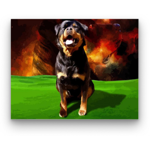 Rottweiler - számfestő készlet – 40×50 cm (Keret nélkül) A kép energikus és dinamikus hangulatot áraszt, ahogy a rottweiler büszkén áll a háttérben tomboló színek előtt. Egy izgalmas történetet sugall, mintha egy hős védelmezné a világot. A kontrasztos zö