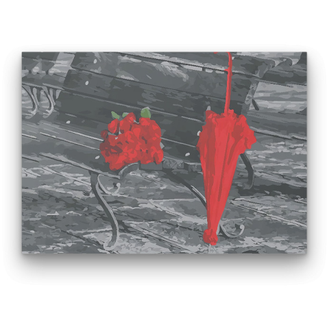 Rózsa és esernyő - számfestő készlet – 40×50 cm (Keret nélkül) Ez a festmény egy esős nap romantikus pillanatát ragadja meg, amely az elmúlás és a remény érzését hordozza magában. A vörös rózsa és esernyő kontrasztja egy elfeledett találkozás emlékét idéz
