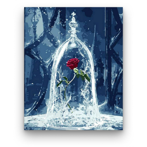 Rózsa üvegben - számfestő készlet – 40×50 cm (Keret nélkül) A kép misztikus és varázslatos hangulatot áraszt, mintha egy mesebeli történet részese lennénk. Egy titokzatos világba vezet, ahol a szépség és a törékenység találkozik. A kék és piros kontrasztj