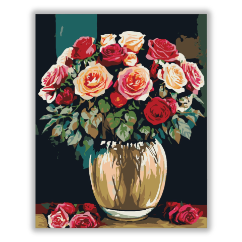 Rózsabokréta - számfestő készlet – 40×50 cm (Keret nélkül) A festmény varázslatos hangulatot áraszt, mintha egy romantikus kert közepén állnánk. A rózsák élettel teli színeiben egy történet bontakozik ki, mely a természet szépségét ünnepli. A sötét háttér
