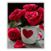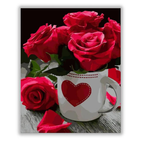 Rózsás bögre - számfestő készlet – 40×50 cm (Keret nélkül) A kép romantikus hangulatot áraszt, mintha egy szerelmes üzenetet közvetítene. A bögre és a rózsák találkozása egy történetet mesél el a szeretetről és az intimitásról. A vörös rózsák élénksége ko