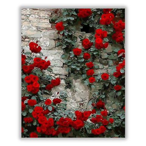Rózsafal - számfestő készlet – 40×50 cm (Keret nélkül) A kép romantikus hangulatot áraszt, mintha egy titkos kertbe vezetne. A vörös rózsák buja burjánzása egy elfeledett történetet mesél el, ahol a természet visszahódítja a teret. A zöld és vörös színek