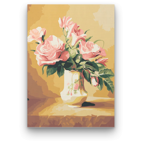 Rózsák Vázában - számfestő készlet – 40×50 cm (Keret nélkül) A kép meleg, barátságos hangulatot áraszt, amely azonnal magával ragadja a nézőt. Egy történetet mesél el egy csendes, napfényes délutánról, ahol a természet szépségei életre kelnek egy vázában.