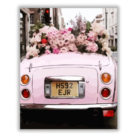 Rózsaszín autó2 - számfestő készlet – 40×50 cm (Keret nélkül) Ez a festmény egy romantikus utazás hangulatát idézi elő, mintha egy virágokkal teli álomvilágba repítene. A kép mesés történetet sugall, ahol a rózsaszín autó a boldogság és szabadság szimbólu