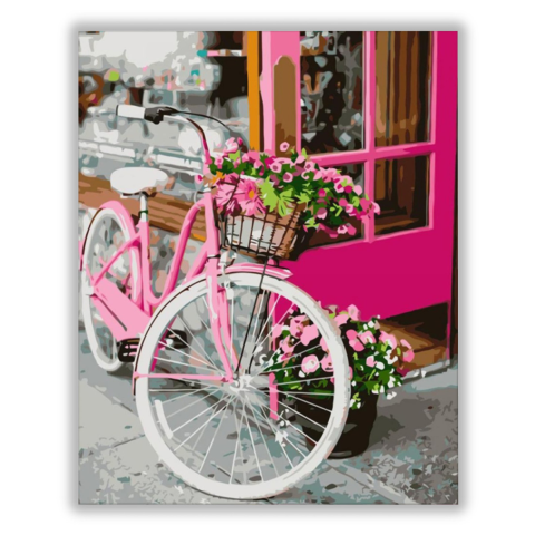 Rózsaszín bicikli - számfestő készlet – 40×50 cm (Keret nélkül) A festmény egy nosztalgikus hangulatot áraszt, amely a városi romantikát idézi fel. Egy történet bontakozik ki a kép előtt, ahol a rózsaszín bicikli és a virágok találkozása egy elfeledett ny