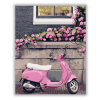 Rózsaszín robogó - számfestő készlet – 40×50 cm (Keret nélkül) Ez a festmény egy nosztalgikus, mégis élénk hangulatot áraszt, amely azonnal magával ragadja a nézőt. A rózsaszín robogó mesés történetet mesél el egy csendes városi utcán, ahol a virágzó bokr
