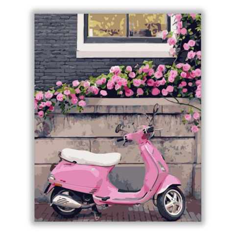 Rózsaszín robogó - számfestő készlet – 40×50 cm (Keret nélkül) Ez a festmény egy nosztalgikus, mégis élénk hangulatot áraszt, amely azonnal magával ragadja a nézőt. A rózsaszín robogó mesés történetet mesél el egy csendes városi utcán, ahol a virágzó bokr