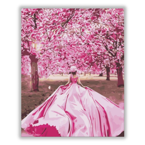 Rózsaszínben - számfestő készlet – 40×50 cm (Keret nélkül) A festmény egy mesebeli világba kalauzol, ahol a rózsaszín virágok tengere körülöleli az álmodozót. Egy titokzatos történet bontakozik ki a háttérben, ahol minden szín és árnyalat egy újabb érzelm