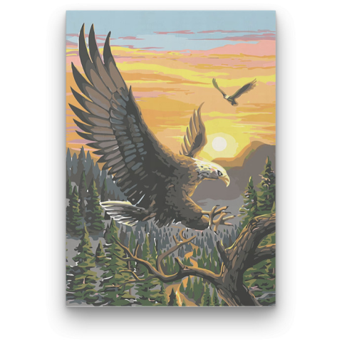 Sasok - számfestő készlet – 40×50 cm (Keret nélkül) Ez a festmény magával ragadó szabadságérzetet kelt a nézőben, ahogy a sasok szárnyalnak az égbolt alatt. A háttérben megbúvó hegyek és fenyvesek egy történetet mesélnek el a természet vad szépségéről és