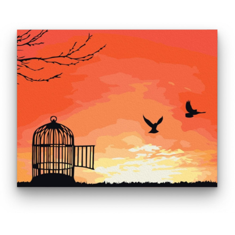 Szabadság - számfestő készlet – 40×50 cm (Keret nélkül) A festmény meleg, naplemente színeivel azonnal magával ragadja a nézőt, a szabadság ígéretét hordozva. Egy nyitott kalitka és szárnyaló madarak mesélik el a történetet az elengedésről és az új kezdet