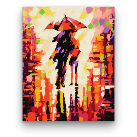 Szerelem Van a Levegőben - számfestő készlet – 40×50 cm (Keret nélkül) A kép egy esős nap hangulatát idézi, ahol a színek kavalkádja romantikus és melankolikus érzést kelt. A háttérben megbúvó alakok titokzatos történetet mesélnek el, mintha a város nyüzs