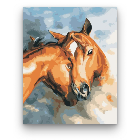Szerelmes lovak - számfestő készlet – 40×50 cm (Keret nélkül) A festmény egy meghitt, szinte tapinthatóan érzelmes pillanatot ragad meg, amely azonnal magával ragadja a nézőt. A képen ábrázolt történet a természet és az érzelem tökéletes harmóniáját mesél