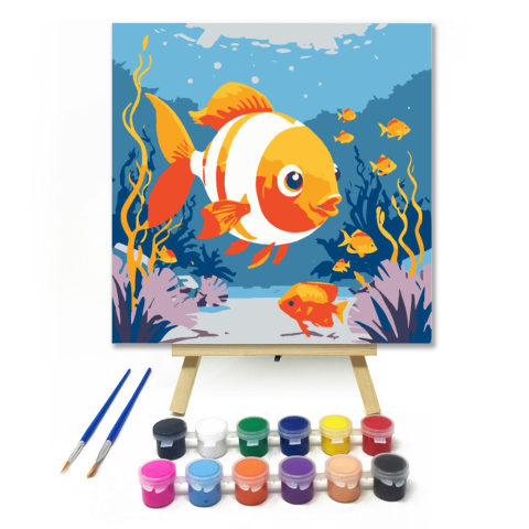 Színes halraj - gyerek számfestő készlet – 20×20 cm (Keret nélkül) Ez a kép egy vidám kis halacskát ábrázol, aki barátaival úszkál a víz alatti világban. A színes kavalkád igazi kalandra hívja a gyerekeket, hogy felfedezzék a mélységek titkait. Tökéletes