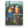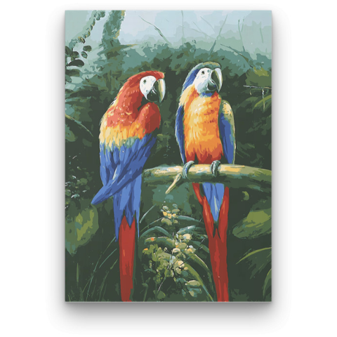 Színes Papagájok - számfestő készlet – 40×50 cm (Keret nélkül) A festmény vibráló színei azonnal magukkal ragadják a nézőt, mintha egy trópusi paradicsomba repítenék. Két színes papagáj ül egy ágon, csendes beszélgetésük történetet mesél a dzsungel mélyér