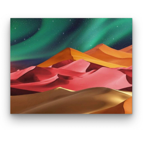 Színes Sivatag - számfestő készlet – 40×50 cm (Keret nélkül) A festmény egy varázslatos sivatagi tájat ábrázol, ahol a homokdűnék színes kavalkádja találkozik az égbolt csillogásával. Az élénk színek és a misztikus égbolt sejtelmes történeteket mesélnek a