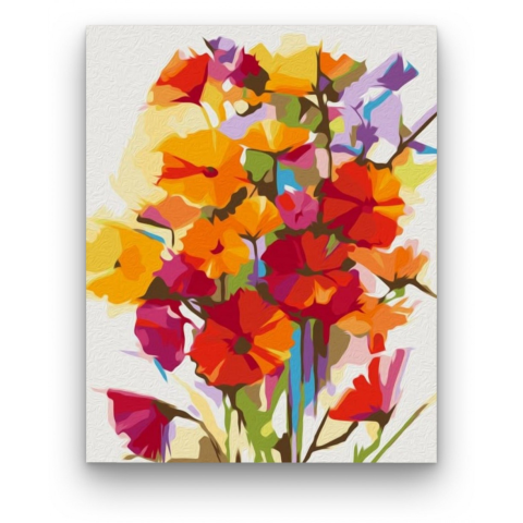 Színes Virágszálak - számfestő készlet – 40×50 cm (Keret nélkül) Ez a festmény vibráló energiával tölti meg a teret, ahogy a színek kavalkádja életre kel. A virágok szinte mesélnek egy örömteli tavaszi napról, ahol minden szín és forma harmóniában van. A