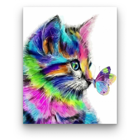 Szivárvány cica és pillangó - számfestő készlet – 40×50 cm (Keret nélkül) Készíts gyönyörű műalkotásokat, előzetes festő tudás nélkül! Éld át az alkotás gyönyörű pillanatait és varázslatos hangulatát! Akkor is gyönyörű festményeket hozhatsz létre, ha még