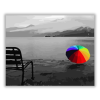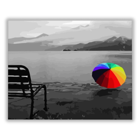 Szivárványos esernyő - számfestő készlet – 40×50 cm (Keret nélkül) A kép csendes melankóliát áraszt, miközben a színes esernyő élénksége reményt sugall a szürke tónusú tájban. Egy magányos történet bontakozik ki, ahol az esernyő a változás és az újrakezdé
