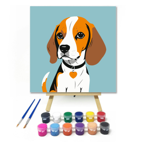 Szíves nyakörvvel - gyerek számfestő készlet – 20×20 cm (Keret nélkül) Ez a kép egy bájos kutyust ábrázol, aki szíves nyakörvvel büszkélkedik. A vidám színek és a kedves tekintet azonnal mosolyt csalnak az arcodra. Tökéletes választás a gyerekek első krea