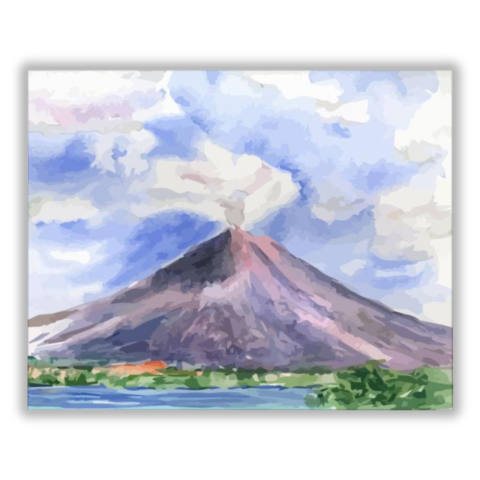 Szunnyadó vulkán - számfestő készlet – 40×50 cm (Keret nélkül) A festmény nyugalmat áraszt, mégis a természet erejét sugározza. A távoli vulkán füstje mesél egy ősi történetet a föld mélyéről. A kék és zöld színek harmóniája keretbe foglalja a kompozíciót