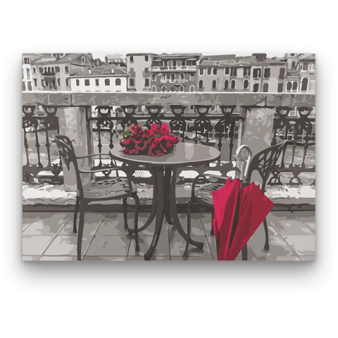 Szürke és Bordó Terasz - számfestő készlet – 40×50 cm (Keret nélkül) A festmény egy csendes, romantikus hangulatú teraszra kalauzol, ahol a szürke és bordó színek találkozása emlékezetes pillanatokat idéz elő. A kompozíció mögött rejtőző történet a városi
