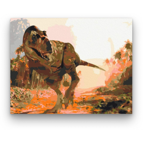 T-Rex - számfestő készlet – 40×50 cm (Keret nélkül) Ez a kép az őskor vad és lenyűgöző világába repít, ahol a T-Rex uralkodik a tájon. A festményen megjelenő hatalmas lény mintha egy rejtélyes történetet mesélne el, tele feszültséggel és kalanddal. A mele