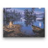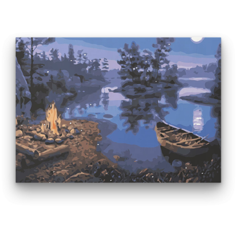 Tábortűz a Folyónál - számfestő készlet – 40×50 cm (Keret nélkül) A festmény egy nyugodt éjszakai tájat ábrázol, ahol a tábortűz meleg fényei barátságosan világítják meg a folyópartot. Egy elhagyatott csónak és a titokzatos holdfény sejtelmes történetet s