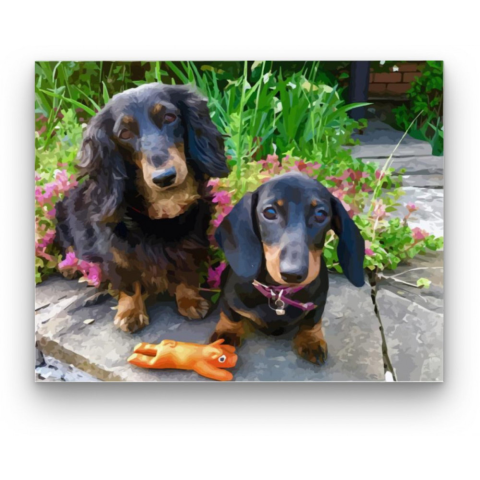 Tacskók - számfestő készlet – 40×50 cm (Keret nélkül) A festmény melegséggel és vidámsággal tölti meg a teret, ahogy két barátságos kutya tekintete találkozik a nézőével. A háttérben megbúvó virágok és zöld növények egy idilli kert hangulatát idézik, ahol