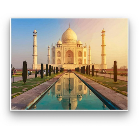 Taj Mahal - számfestő készlet – 40×50 cm (Keret nélkül) Készíts gyönyörű műalkotásokat, előzetes festő tudás nélkül! Éld át az alkotás gyönyörű pillanatait és varázslatos hangulatát! Akkor is gyönyörű festményeket hozhatsz létre, ha még nem festettél vász
